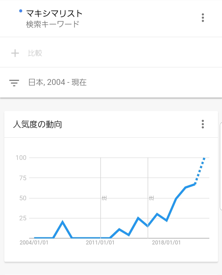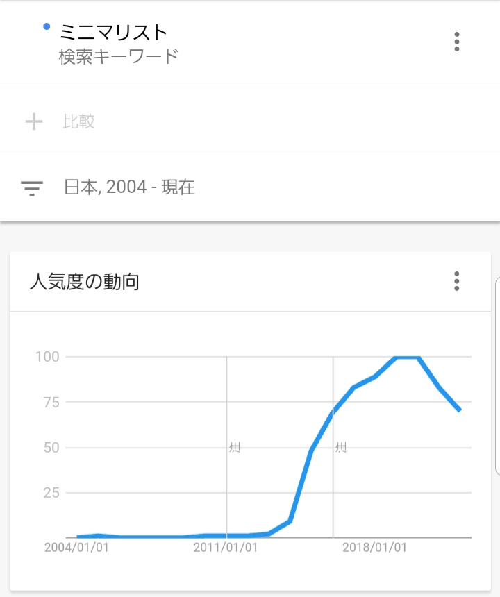 確かに、ミニマリストというワード検索(グーグル検索)では、2020年頃を境に、ピークを超えているのが分かりますね