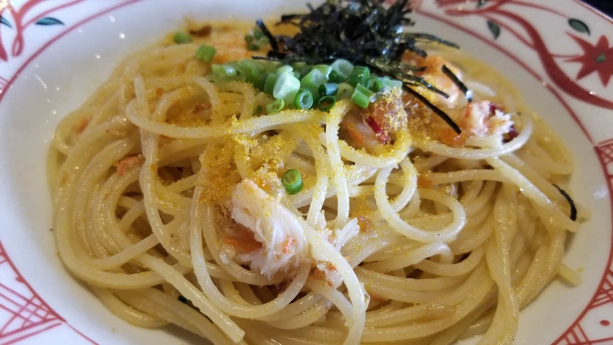 - 紅ズワイガニと海老と本からすみのアーリオオーリオペペロンチーノ