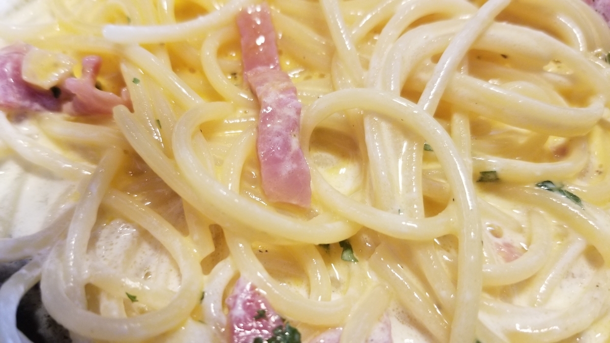 カルボナーラに欠かせないベーコンも惜しみ無く入っています