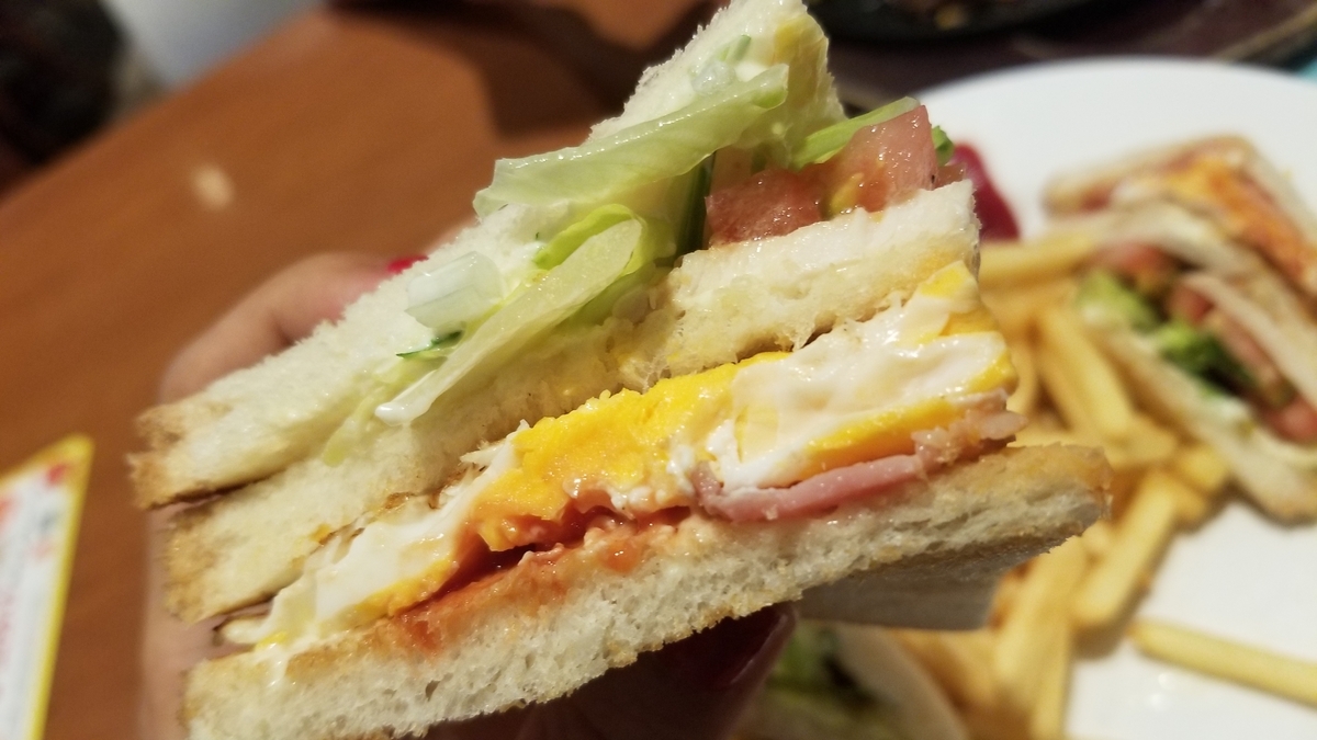 トマトにレタスにたまご、ベーコンと何層にもなって食べ応え満点のサンドになっています
