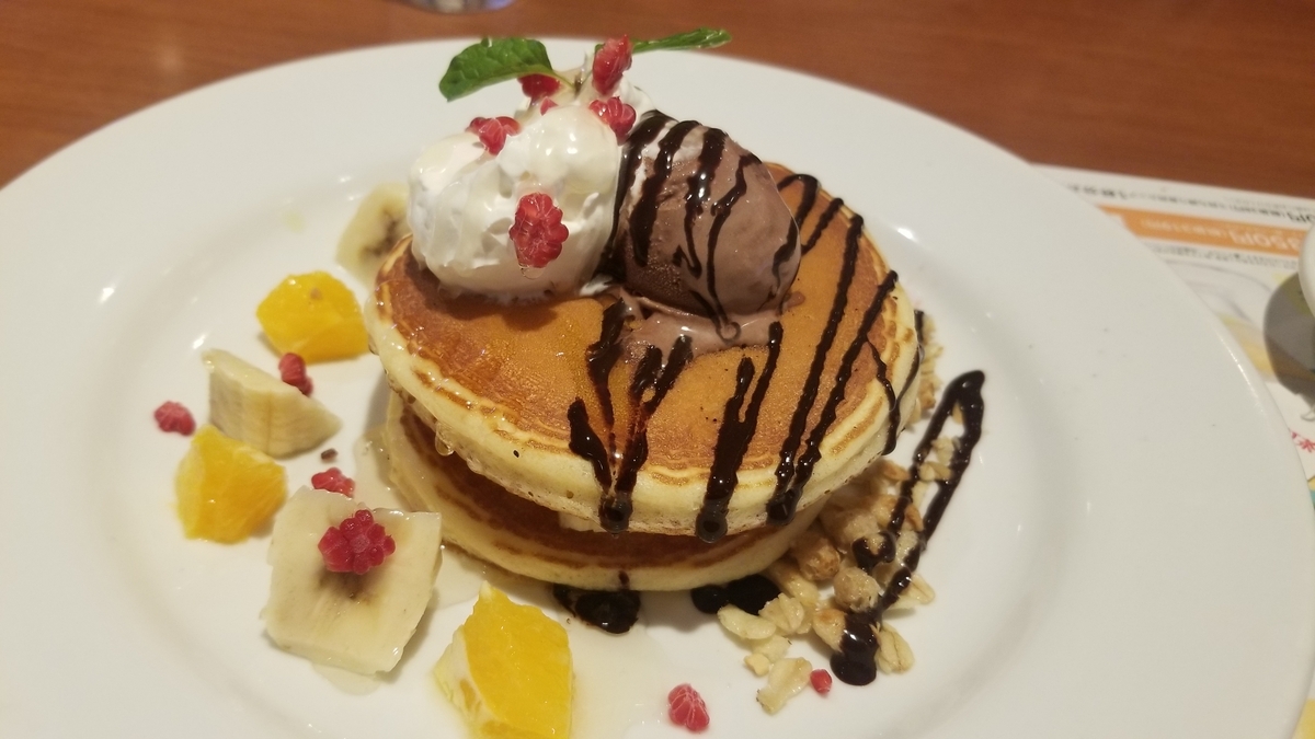 上にはたっぷりのクリームとチョコレートアイスが乗っており、熱々のパンケーキと冷や冷やのアイスの温度差も楽しめるものになっていました