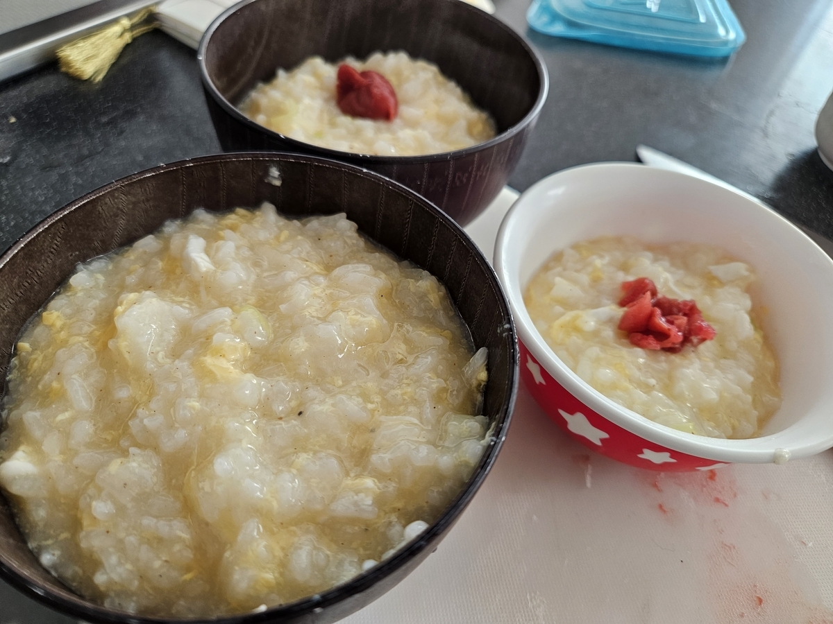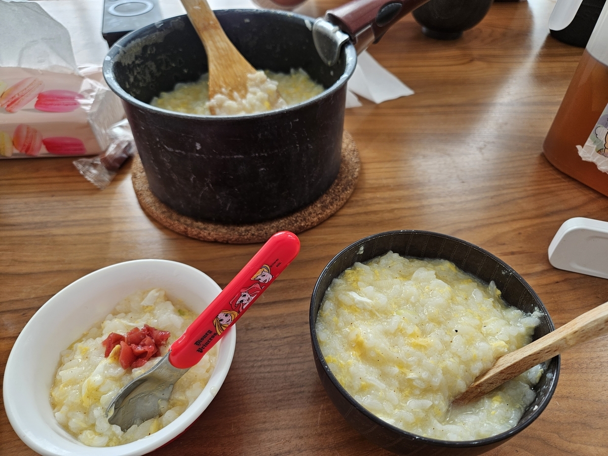 家族3人全員おかゆで、とにかくカロリーを摂取した昼でした