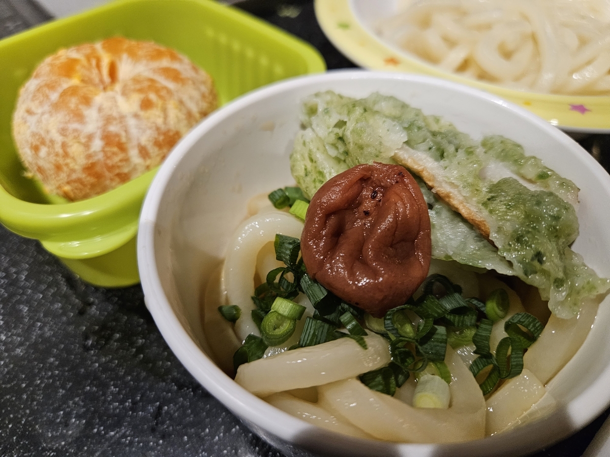 子供はお子様ラーメンを食べた上で、夜もうどんがいいらしく、子供用に梅干しうどんを作りました