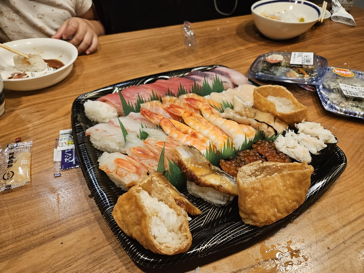 お昼は会社のデスクで爆弾おにぎりを2つ頬張り、夜は運動会をがんばった子供のリクエストでお寿司です(スシロー)